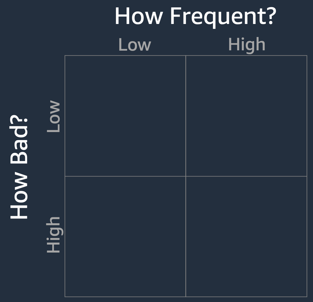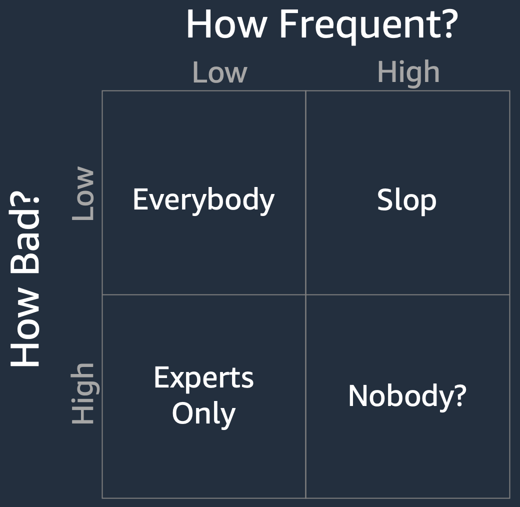 - High defect frequency, high defect seriousness. Basically nobody. Except maybe a small set of true believers and early adopters. If an agent is making highly consequential mistakes often, it’s simply not going to be useful to a lot of folks.
